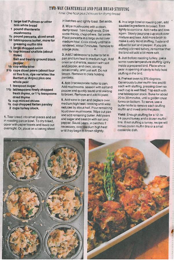 No, not Santa’s whiskers and the covers, but stuffing and the turkey. I’ve been making big holiday dinners for decades. Until I found and tested this recipe from the NY Times, I’ve always thought that stuffing had to be in the bird. It just didn’t have that special stuffing wonderfulness any other way. But since I tried this muffin cup stuffing, I’ve been a convert. It’s time consuming to make–takes over an hour to do the various things–but really worth it. I’m never going back. An extra plus: the bird cooks faster and more evenly without stuffing (sorry about the grease marks, they were well-earned):