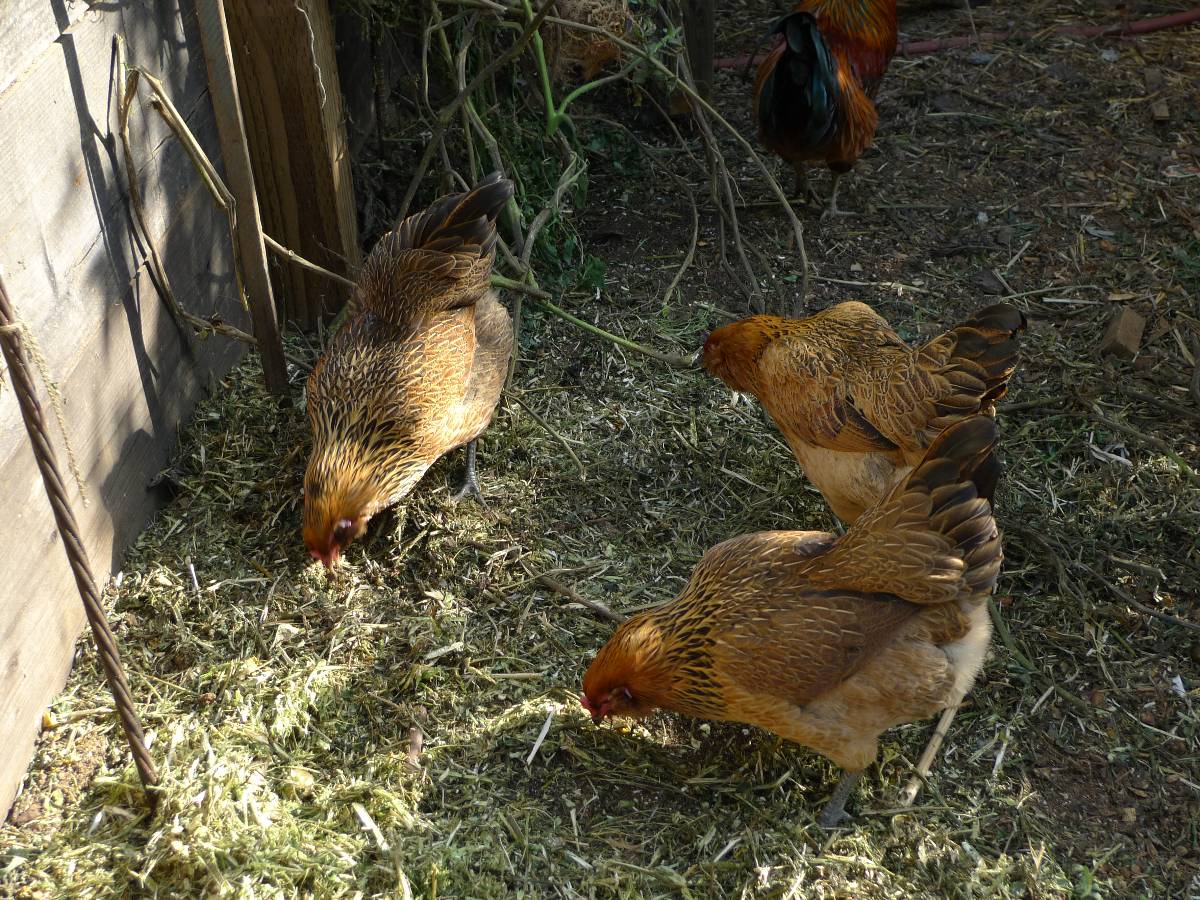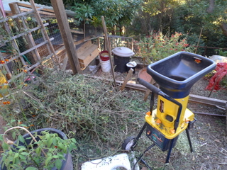 The tomato vines were a bigger challenge. There were a lot of them! And I had put off taking them down because there were still so many green tomatoes. But now the green ones are ripening on the window sill. It took me three afternoons to pile up all the vines, and then all day to put them through my wonderful Eco Shredder. The shredder is a great tool, and from three huge piles of dead vines, I have about a small garbage can full of wonderful fine green-brown mulch. I let the chickens out and they were very willing to help with the cleanup. They love to forage, and ate quite a bit of the shredded vines, even though they don’t like tomato plants normally.