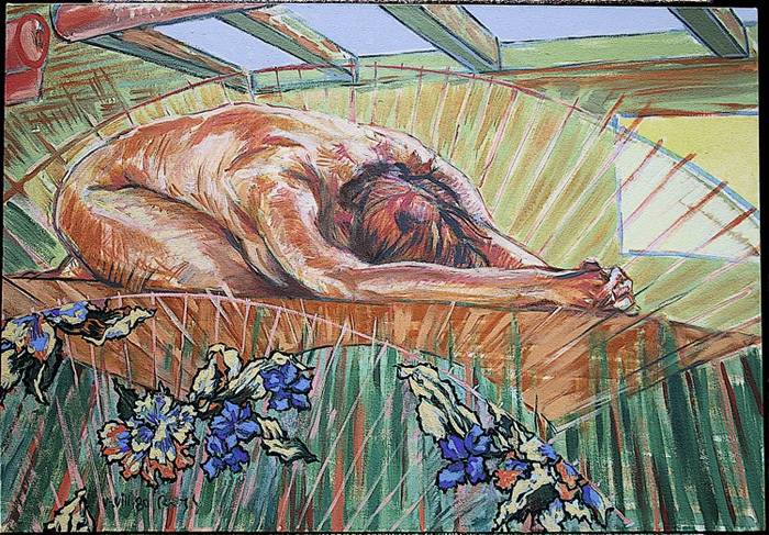 I remember reading an interview with Bob years ago, I think it was in a publication of the Mendocino Art Center. Bob said something like, “You sit down and draw for a few hours every day for ten years, and you begin to get better at it.” By now Bob’s been doing this every day for decades, and his work is extraordinary. One of the oils (among many) that particularly charmed my eye is this rather formal nude with an asian influence, entitled Spring.