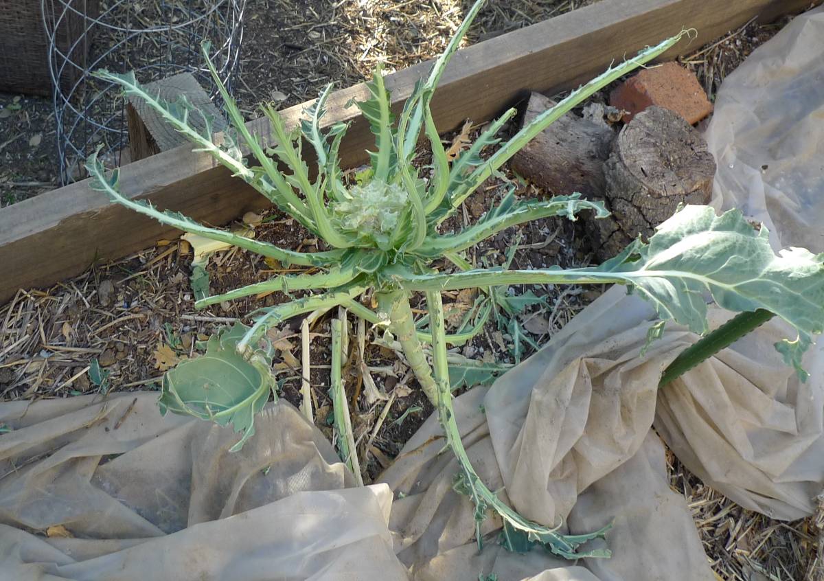 I’ve been letting the chickens out into the winter garden to weed and fertilize. I cover or fence off the few crops I don’t want them to eat. But the chickens are curious and persistent. Yesterday, they managed to peel back the ground cover over the last cauliflower and strip it:
