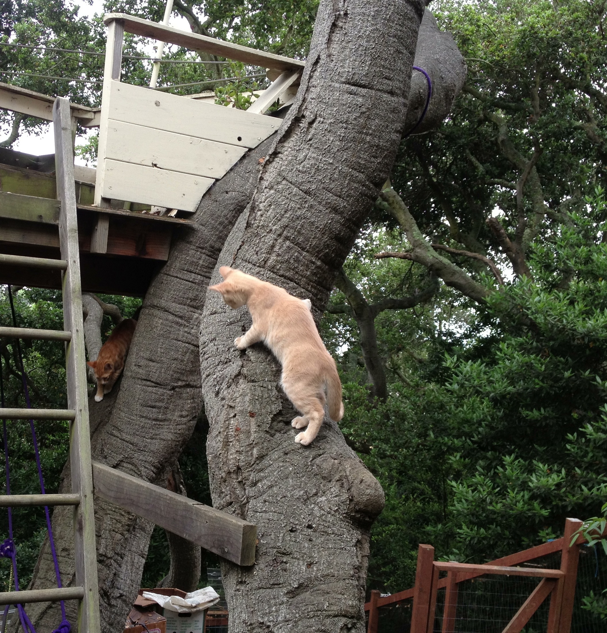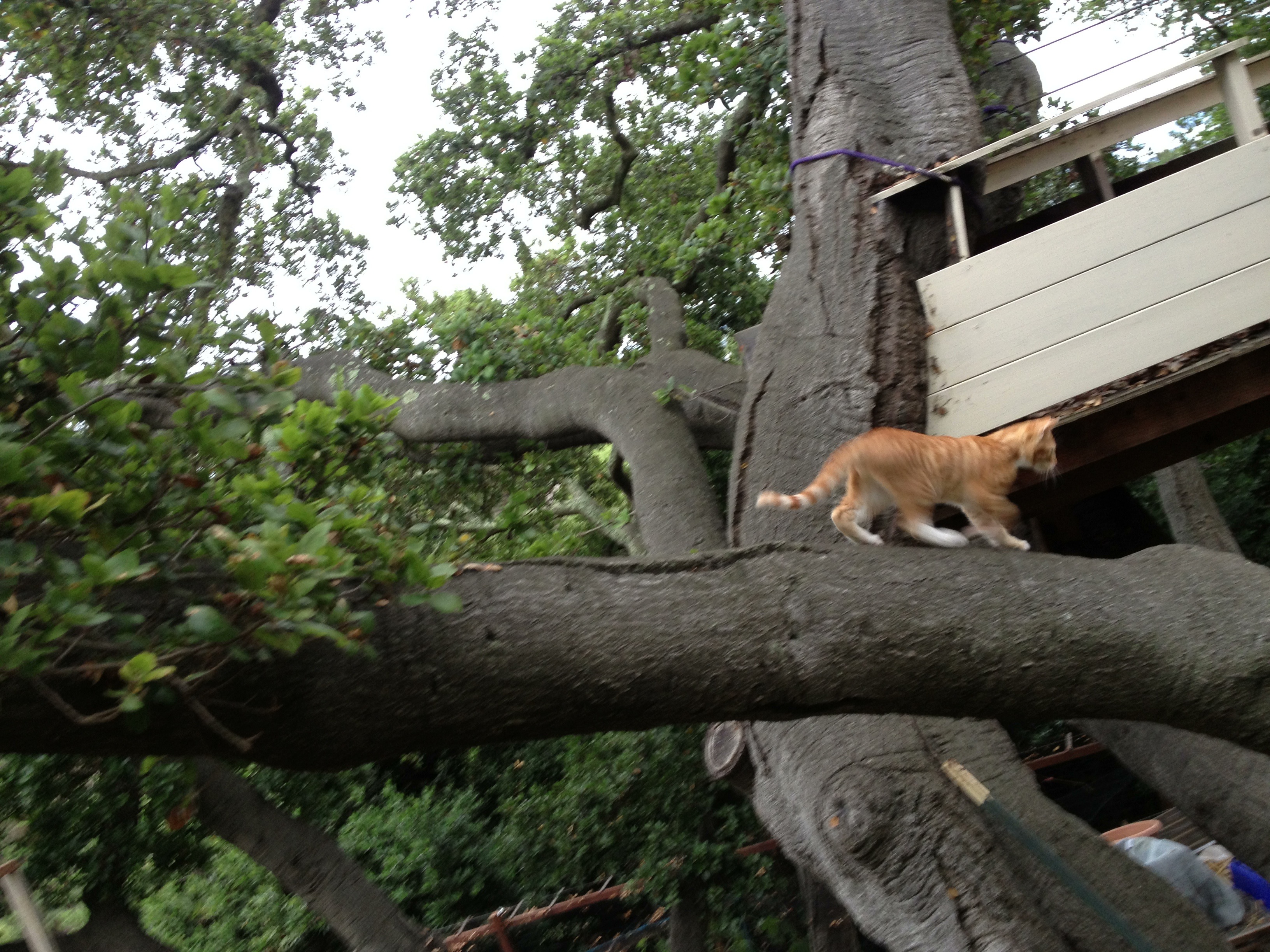 It’s the time of year when everything is overgrown and it’s very hard to harvest without treading on something. Next year, more order in the garden! But for now we have loads of produce, the kittens are having a lot of fun exploring, and they have discovered the tree. They’ve even learned how to climb down.