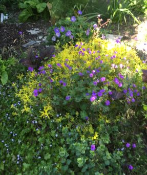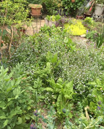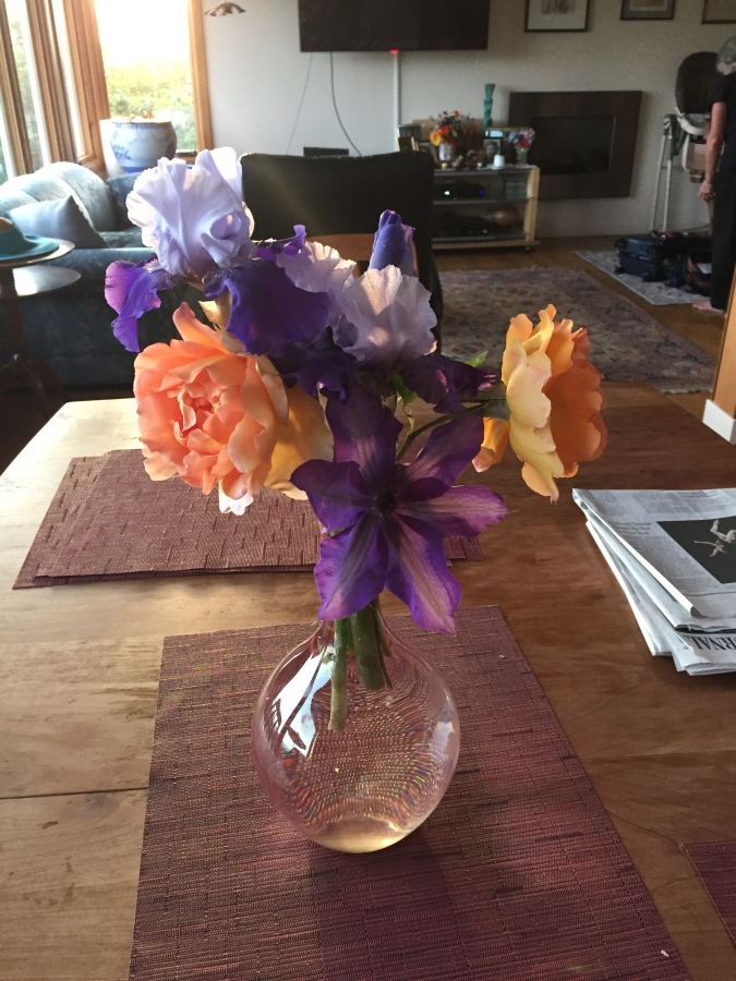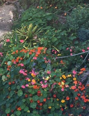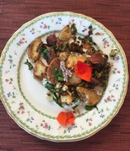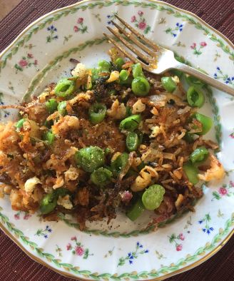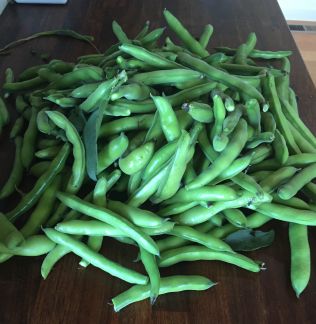Soon they pop up tall and full of flowers. Then the many branched stems have many big seed pods. You have to pick them fast before they get too fat. Then comes the shucking, parboiling, peeling, and eating. Once you’ve parboiled and peeled them, they can go into almost any dish.