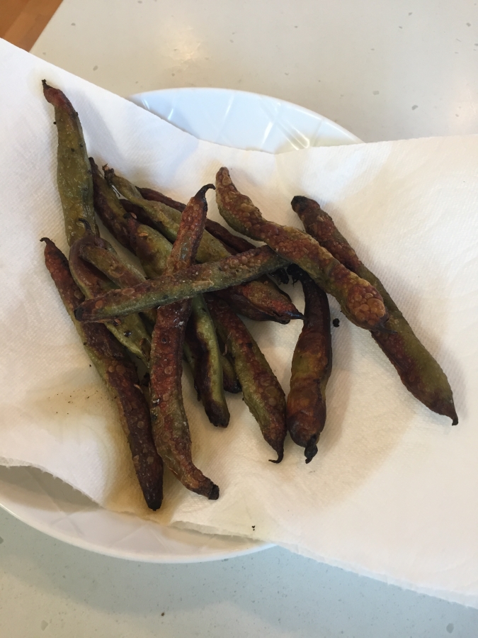 But now I’ve learned you can also roast them whole in the pod with a little olive oil, salt, and spice–they come out crispy and delicious. You can eat the whole thing!
