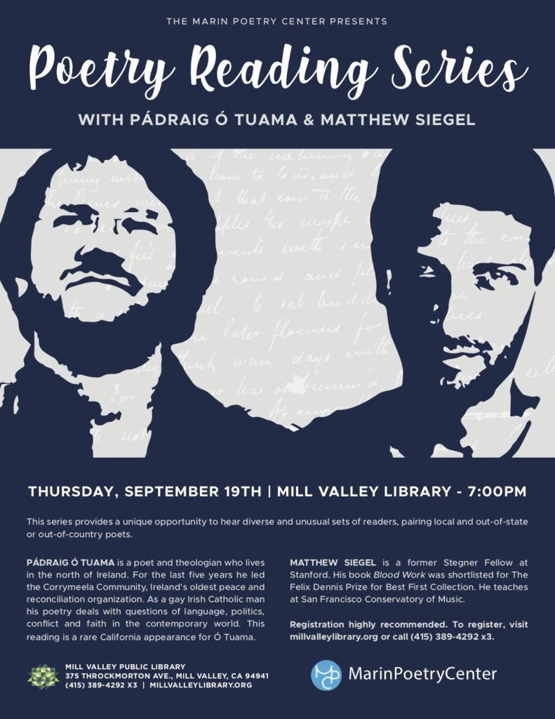 You may remember a couple of pasts posts of poems by Pádraig Ó Tuama. If you are local to the Bay Area, you have an opportunity to hear him live this Thursday evening at 7 at Mill Valley Library. Details below. I think it’s going to be an excellent reading. It’s free, but click here to register to be sure you have a seat: https://conta.cc/2zwYWMa