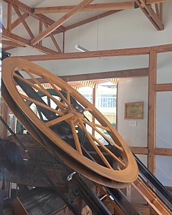 It’s motorized, of course, but the two cars are also counterweights to each other, with a cable that rolls over a giant wheel at the top.