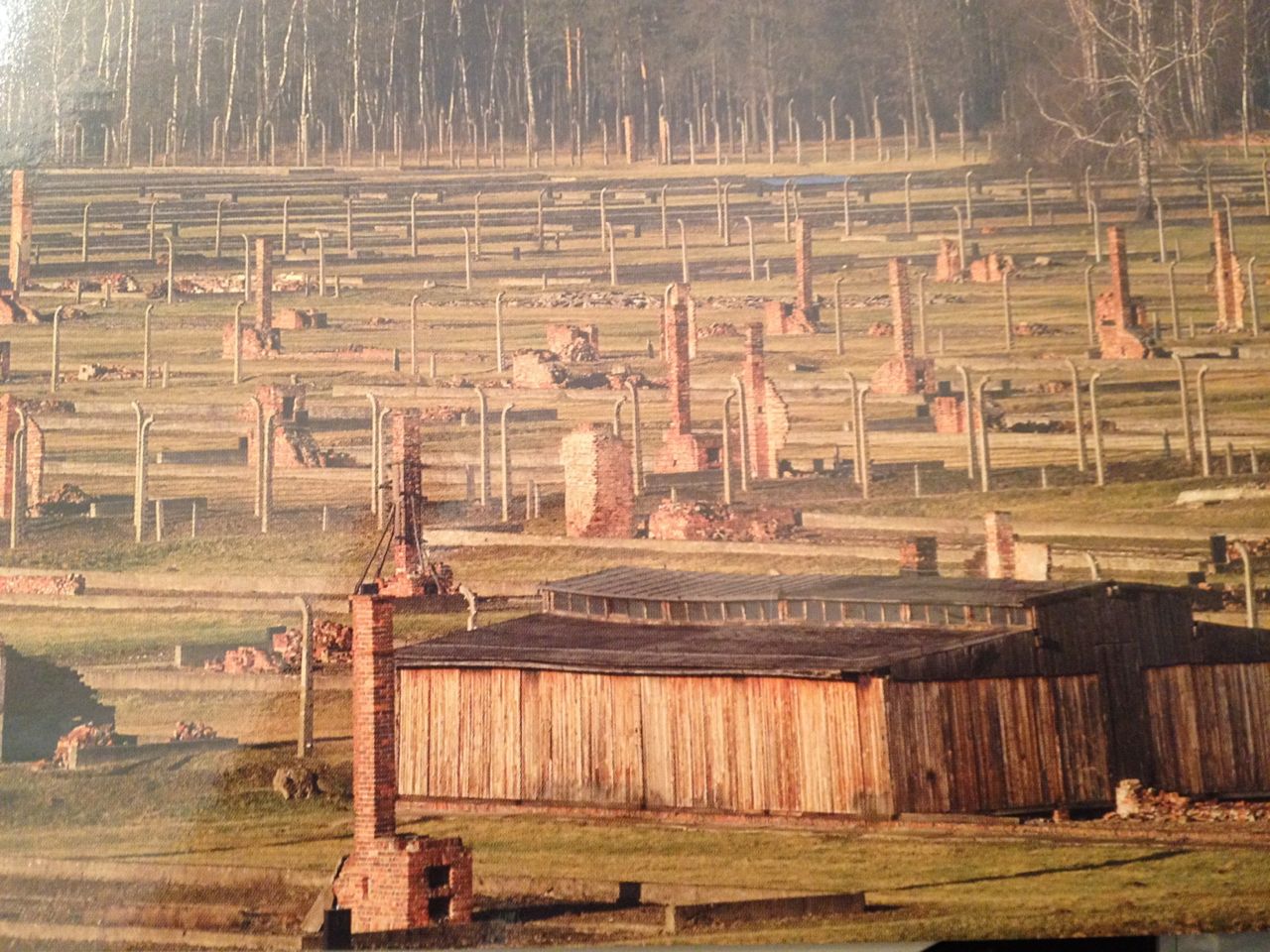 Many visitors are high-school students. At Auschwitz they’ve arranged exhibits by country in the old barracks, one block for the Jews of the Netherlands, one for Czech Jews, a huge exhibit for the over three million Polish Jews. Eyeglasses, canisters of Zyklon B, the ruins of the crematoria, maps of how they worked: the undressing rooms, the furnaces.