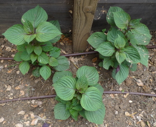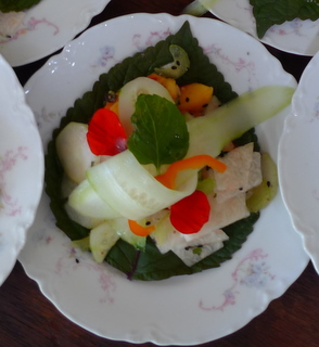 I wanted to use as many ingredients as I could that are not available commercially. This included calamondins–a small orange, Filipino lime–from my neighbor’s tree, and shiso leaves and white alpine strawberries from my garden. The chef noticed and appreciated each one—it’s so much fun to cook for someone who really tastes his food. As I made the stew the day before, I had time to play around with the salad. I put a big shiso leaf on each salad plate, and chopped some mint and shiso together to add to the vegetables. (Shiso is from the mint family and tastes slightly minty.) I sliced the cucumbers and jicama on the mandoline, and made some long cucumber slices, added some sliced orange pepper, pink grapefruit sections and a chunks of ripe peach, and sprinkled it with black sesame seeds. I used the long thin slices to make a cucumber bow on top, with a nasturtium leaf and a leaf of orange mint. I made a citrus vinaigrette with calamondin and grapefruit juice, champagne vinegar, olive oil and a little sugar.