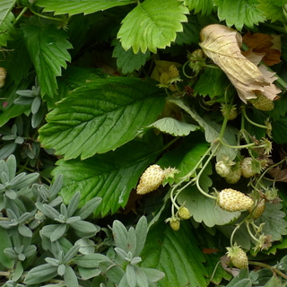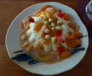 The crème celeste is a simple cream, yoghurt, sugar and gelatin dessert. I added one small, peeled and pureed peach and served with peaches simmered in sugar and brandy and topped with the alpine strawberries.