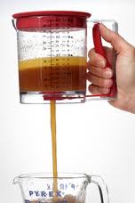 After you’ve strained out the vegetables, there will probably be a layer of fat on top of your stock that you don’t want. You can put it in the refrigerator; the fat conceals, making it easy to peel off the now gelatinous stock. Or you can invest in a wonderful fat separator, a four-cup container with a hole in the bottom that opens when you press a lever in the handle. Let your stock sit for 10 minutes or so in the container so the fat rises to the top, then you can open the hole and “decant” the stock down to the fat level, discarding the top bit.