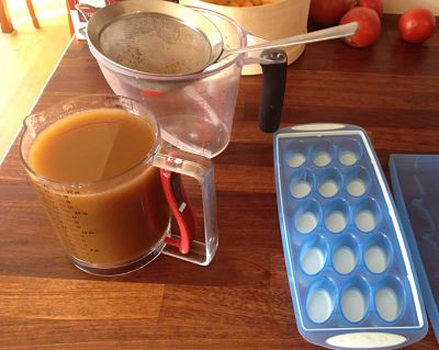 If you’re going to freeze the stock, simmer it more to concentrate it. Then strain it once with a fine mesh strainer, and pour it into ice cube trays.