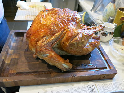 Before the New Year, I posted the results of my turkey experiments based on J. Kenji López-Alt’s ideas for spatchcocking and baking stone approaches. But for my last experiment, I combined the baking stone with a method I learned from the late Marshall Harrison, owner and chef of a famed Connecticut steak house (and my cousin by marriage). His method was to put the whole bird on a rack over an inch or two of liquid in a tightly covered pan. The pan should be airtight–or at least have a very tightly fitting lid. I bought a good tight-fitting large roasting pan years ago from a restaurant supply company. You heat the oven to 500 degrees, steam the bird, then turn down to 450 and let it brown.