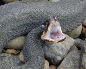 I found this poem, describing what happened to a poisonous water moccasin (also called cottonmouth) after a tornado, in a book of essays by Forrest Gander. The syntax and typography are a little difficult, a little tornado wracked, but the image of the snake’s fangs embedded in its own body is pretty vivid: