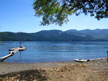 1942 Float House at Camp 6_optThe float house looked something like this if you take away the other houses and canoe,  cut off the extension on the left and add a footbridge from the shore. It was three rooms, furnished with rickety chairs and table, a saggy bed in each bedroom. There must have been a bathroom, though I don’t remember it or how the plumbing worked in relation to the lake. The lake itself was magnificent. In fact, if you plunked the float house at the end of this walkway, you ‘d have a sense of it.