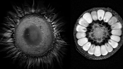 sunflower and corn MRI_optIn any case, we had an interesting evening talking about it. And this morning, I found these animated MRI scans of vegetables (via the Bennington Garden blog) that seem appropriate to this discussion. You might call them, the inner life of vegetables. I especially like the garlic.