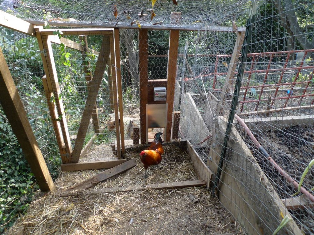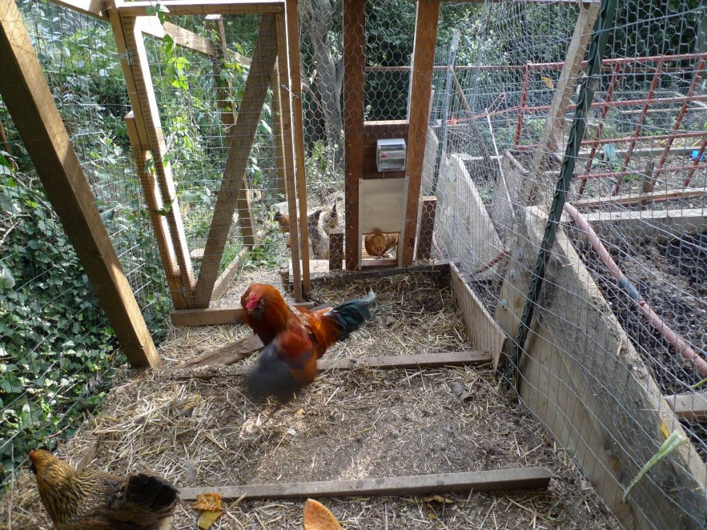 I love my chickens, but I also love to travel. I have already set up automated feed and watering systems and thanks to a friend who came to visit, I now have an automated chicken door that opens at dawn and closes at dusk. This amazing invention is from Wells Poultry in the UK, and came to me airmail. I couldn’t quite believe it would work, but it does. I set it up at the back of the covered area where the chickens are closed in at night as opposed to on their house itself. It’s very shady by the house, and I was afraid “dusk” there would be too early. We had to make a little ramp going down from the door, as the chicken yard is steep, and they were a little reluctant at first. Several hens went out, then the rooster.