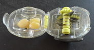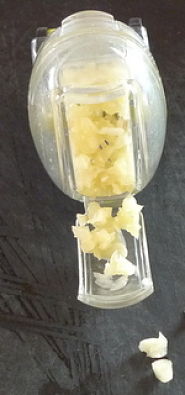 garlic chopper1_optgarlic chopper2_optThe rolling garlic chopper–put in peeled cloves, close the flap, roll it along a hard surface, and voila: minced garlic. It comes apart for easy cleaning, too. You just have to be careful to save the little gear with the blades inside the plastic shell and not lose it! I mince a lot of garlic.