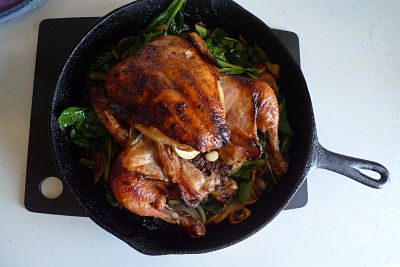 I thought of this today, trying a recipe by Melissa Clark for roast chicken that is supposed to be an easy way to get the whole chicken to cook quickly and evenly. It’s a little like spatchcocking, which is cutting the backbone out and laying the bird flat, but in this case, you just cut the skin of the legs so you can flatten the chicken into a very hot frying pan and roast it in a very hot oven.