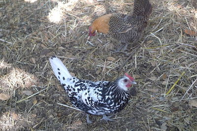 ChickensA reader asked, “Why haven’t I seen anything about them lately?” There are currently 11 hens and a rooster, the soft-voiced, gentlemanly Cloud, a Lavender Americana. The flock consists of three of my original six Americanas, four young Americanas, a Black Sex-linked hen, a Silver Wyandotte hen, and two banty hens. It’s almost impossible to get a picture of them altogether, but here are most of them, busily hunting for a handful of grain.