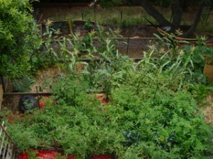 It’s a very foggy August here in the East Bay, and I think the red mulch is really helping the garden to flourish. I have a tomato jungle with many green and some ripe tomatoes, corn almost ready to eat, baby eggplants and artichokes, squash (always a plethora of those) and cucumbers.
