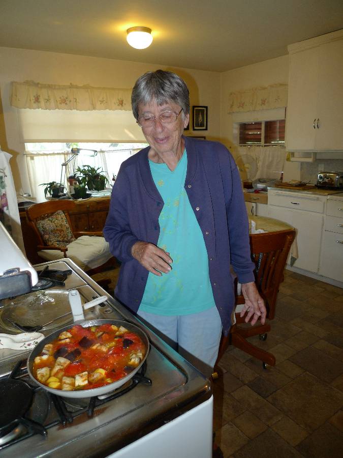 Fig, quince, peach, and apple trees groan with fruit. There is no substitute in fruit trees for time. She was cooking ratatouille with eggplant, tomatoes and squash when we arrived.
