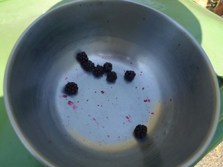 But alas, despite our hopes, our buckets, and our enthusiasm, the berry crop seemed either desiccated—brown nubs instead of berries–or picked over. After an hour, I had seven berries in my bowl, while Toby had about seventy burs in his fur.