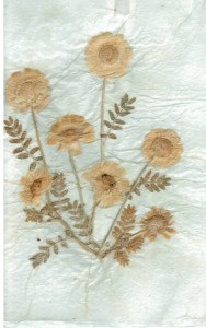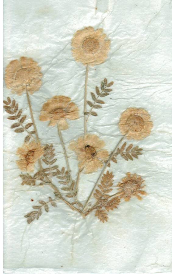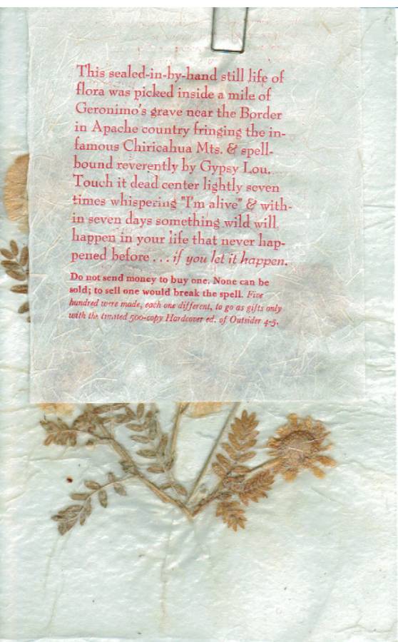 We had a strange artifact that had fallen out of a magazine called “Outsider 4/5” published by Loujon Press. It was a pressed and laminated flower picked “within a mile of Geronimo’s grave.”