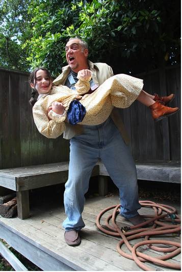 You may remember that for a week or so last summer, our house was host to a movie crew, and I got to meet one of my favorite actresses. Now the movie, which I wasn’t allowed to talk about then, is out. Gena Rowlands, John Scurti (who you may know from the TV Show “Rescue Me”), and Chris Maher star, along with Ruby Alexander who plays Olive. You can see the first five minutes here. It was frustrating that I didn’t know that its theater debut was at the Nuart in LA over the holidays. My whole family could have gone! Now we’ll have to wait till it appears in “a theater near us.” Some of the scenes in the trailer and in the behind the scenes photos are at my house. This photo shows Chris and Ruby on my back deck, complete with the hose I didn’t coil up.