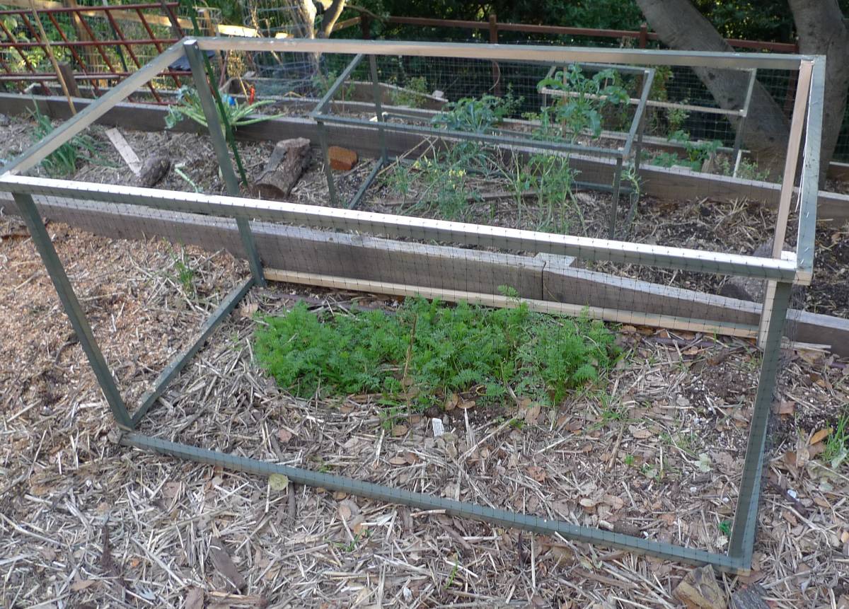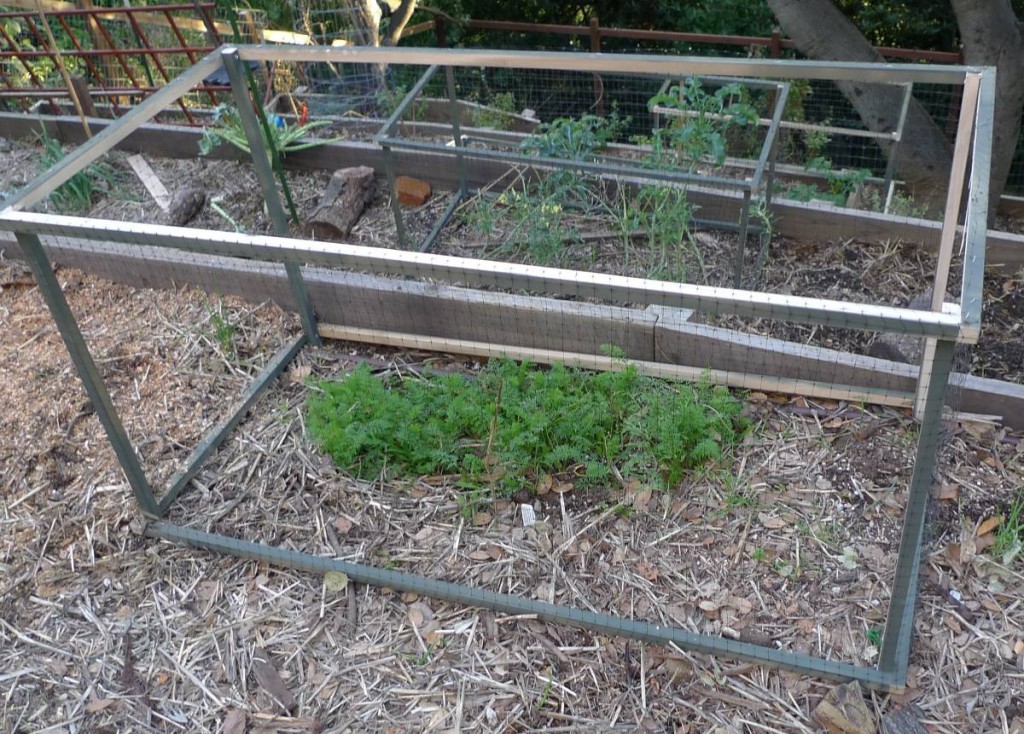 So we created a set of 2′ x 4′ boxes with bird cloth stapled around the sides to put around various areas where things are growing. They are lightweight and transportable. We painted them with camouflage paint so that they blend into the landscape (Jeannie’s idea).