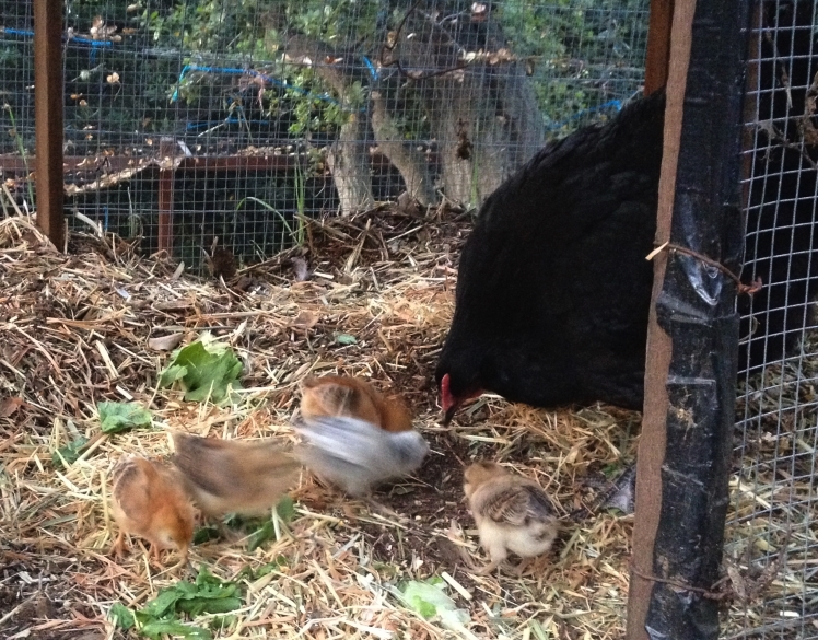 When I ordered chicks, I decided to go for exotics, so I have two Cream Legbars (turquoise eggs), three Coco Marans (mahagony colored eggs), a Black Orpington, an Olive Egger, and a Rhodebar. Some of these look pretty strange. Here’s a Coco Maran and a Black Orpington with her feathered feet:
