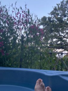 On Friday, I took a dawn hot tub steam curling tranquilly around the sweet peas, heading towards the bay just visible between oak branches. Then I noticed that the electric fence, which guards my chickens from predators, was not blinking, which meant it was shorted out somewhere. I dressed and went down to find a sizable oak limb had split off and crashed through the chicken run, rupturing the bird net and the fence.