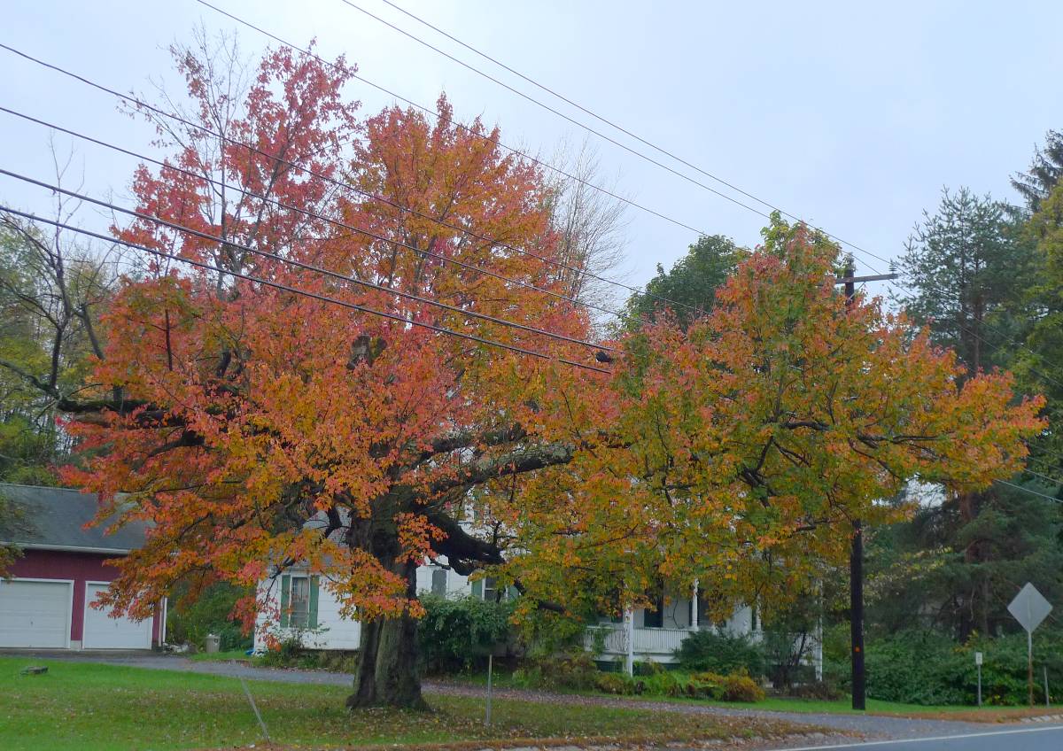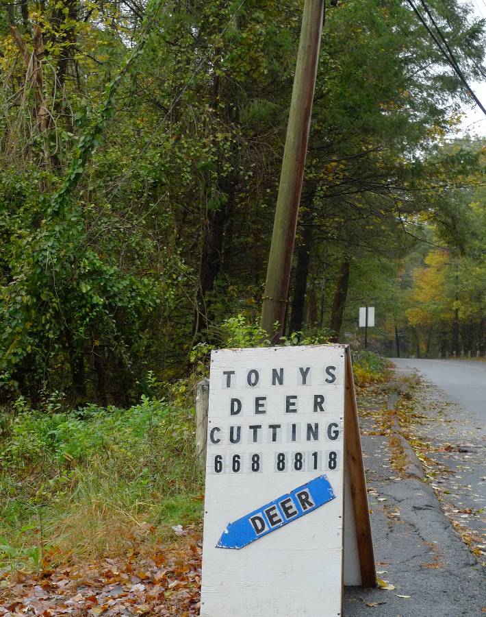 Here’s my favorite sign from Western Massachusetts–a little free publicity for Tony, in case any of you have some fresh deer to slaughter. Along with a taste of that great fall color–I love how this tree has been sculpted around the wires: