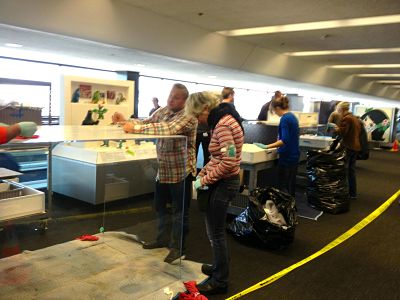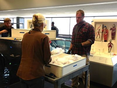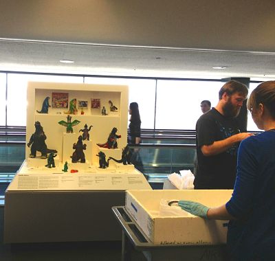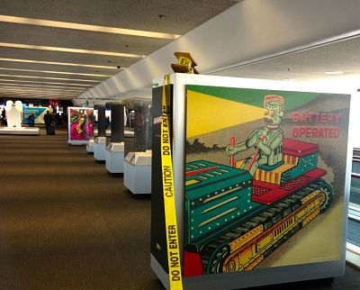 My granddaughter wrote a comment to an earlier post about airport art, and coming home from the East Coast, I saw a team installing the new show, Japanese Toys.  Pretty cool show, I think.  I had to stop and take some pictures. Half of the exhibit was set up, half in progress. Hope you like it, Lila.